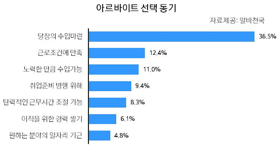 알바를 선택하게 된 동기로는 ‘당장의 수입마련’이 36.5%로 가장 높아 ‘생계형 알바족’이 상당수인 것으로 밝혀졌다.