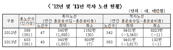 서울 시내버스 전체 노선 403개 중 363개 노선이 적자를 보고 있고, 10억 원 이상의 손실을 보는 노선만도 119개 노선에 이르는 것으로 나타났다.