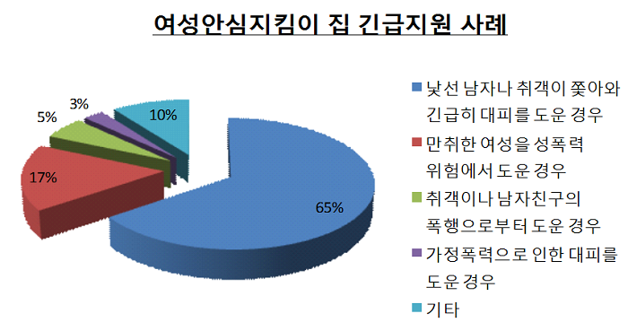 여성안심지킴이 집 긴급지원 사례를 분석해보면, 낯선 남자나 취객이 쫓아와 긴급히 대피를 도운 경우(47건, 65.2%)가 가장 많았으며, 만취한 여성을 성폭력 위험에서 도운 경우(12건, 16.6%)가 그 다음으로 많았다. 또한 취객이나 남자친구의 폭행으로부터 도운 경우(4건, 5.5%), 가정폭력으로 인한 대피를 도운 경우(2건, 2.7%), 기타(7건, 10%)가 있었다.