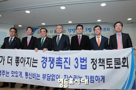 경쟁촉진 3법’ 정책토론회에는 민병두, 이인영, 문희상, 문재인, 전병헌(위 사진 왼쪽부터)의원과 홍종학 의원(오른 쪽 끝) 등이 참석했다. 이날 참석자들은 한목소리로 이동통신, 맥주 시장, 자동차 수리분야에서의 경쟁력을 강조했다. 전병헌 의원은 통신사업자법, 홍종학 의원은 주세법, 민병두 의원은 자동차 외장부품의 디자인보호법개정을 주장했다. 새정치연합은 이를 ‘경쟁촉진3법’으로 묶어 당론화 과정을 밟을 것으로 보인다. 토론회에 참석한 문희상 비대위원장은 축사를 통해 “독과점 된 시장은 독점 재벌 대기업의 부당이익과 소비자의 피해를 낳아 왔다.”고 주장하고 “독과점 된 통신시장은 단말기 보조금 전쟁 등 많은 사회적 문제를 불러일으켰다.”면서 “경쟁촉진 3법은 독과점 재벌 대기업의 기득권에 도전하고 소비자들의 권리를 되찾아주기 위한 경제민주화의 일환이자 국민 생활의 아주 밀접한 민생법안이다.”는 말로 ‘경쟁촉진3법’ 개정을 위한 노력에 힘을 실어 주었다.
