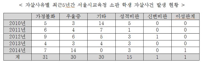 유청 서울시의원이 교육청으로부터 제출받은 「최근 5년간 서울시교육청 소관 학생 자살사건 발생 현황」을 분석한 결과 서울시교육청 소관 학교에서 2010년 27건, 2011년 18건, 2012년 24건, 2013년 14건, 2014년 25건 총 108건의 학생 자살사건이 발생한 것으로 나타났다.