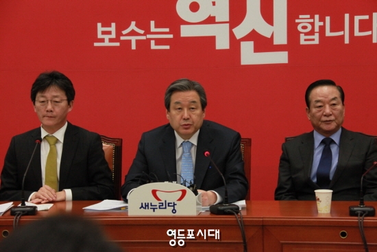 9일 오전 새누리당 김무성 대표(사진 가운데)는 국회에서 최고위원회의를 열고 “공무원연금개혁이 여전히 제자리걸음이다."라고 밝히고 "(그 이유는) 야당이 자체 개혁안을 내놓지 않고 눈치만 보고 있기 때문이다."라고 주장했다.