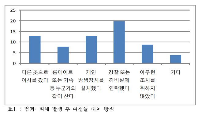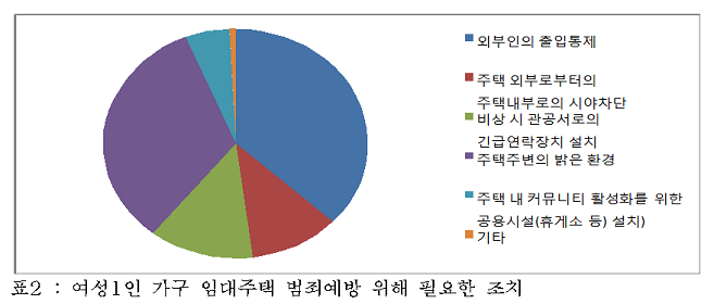 여성1인 가구를 위한 임대주택의 범죄예방을 위해 우선 필요한 조치에 대해 응답자들은 ▲ 외부인의 주택 내부 출입통제(36.8%)를 제일 많이 꼽았다. 그 다음 ▲ 주택 주변의 밝은 환경 조성(33.1%) ▲ 비상 시 관공서로의 긴급연락장치 설치(12.8%) 등이 필요한 것으로 답했다.