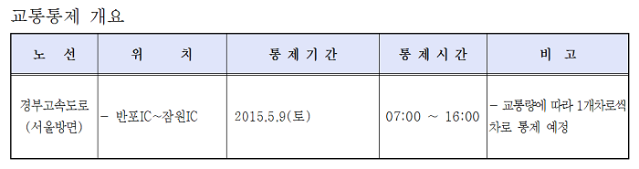 반포 IC~잠원 IC 구간 노면표시 공사에 따른 교통통제서울시설공단은 자동차 전용도로의 안전한 주행서 제공을 위해 5.9(토) 경부고속도로 서울방면 반포 IC~잠원 IC 구간 노면표시 공사를 시행할 계획이다고 8일 밝혔다.