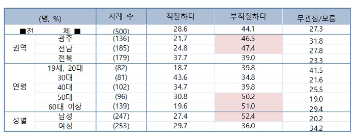 ‘돌직구뉴스’가 매주 여론조사기관 조원씨앤아이와 공동으로 2015년 6월 25일 부터 26일까지 긴급으로 양일간에 걸쳐 박근혜 대통령의 ‘국회법’ 거부권 평가와 새정치민주연합 최재성 사무총장 임명과 관련하여 호남지역 국민을 대상으로 조사한 결과 이 같이 나타났다. 박근혜 대통령이 국회의 시행령 수정 권한을 강화한 ‘국회법 개정안’에 거부권을 행사했습니다. 박 대통령의 거부권 행사에 대해 어떻게 생각하십니까?라는 질문에 ‘잘못한 결정이다’는 응답이 50.9%, ‘잘한 결정이다’는 응답은 36.8%로 나타났으며, ‘모름·무응답’은 12.3%로 나타났다. 충청권과 대구.경북을 제외하고는 모든 지역에서 잘못한 결정이라는 의견이 높았으며, 연령별로는 40대 이하에서 잘못한 결정이, 50대 이상에서는 잘한 결정이라는 의견이 높게 나타났다. 국회법 개정안 재의결 해야 53.4% 국회법 개정안의 재의결에 대해서는 국민의 53.4%가 재의결을 해야 한다고 응답했으며, 28.7%는 폐기해야 한다고 조사됐다. 대구·경북에서는 재의결해야 한다가 36.3%, 폐기해야 한다가 36.4%로 나타나 재의결과 폐기의 여론이 팽팽했지만, 나머지 지역에서는 모두 재의결 해야 한다는 의견이 높게 나타났다. 박근혜 대통령의 거부권 행사에 국회는 어떻게 대처해야 한다고 보십니까?라는 질문에는 응답자의 53.4%가 ‘국회법 개정안을 재의결해 통과시켜야 한다’고 응답했으며, ‘폐기하고 없던 일로 해야 한다’는 응답은 28.7%, ‘모름/무응답’은 17.8%로 나타났다. 국회법 개정안 ‘국회의 정당한 견제’ 47.4% > ‘국회의 과도한 간섭’ 37.3% 국회법 개정안의 의미에 대해서는 ‘국회가 정당하게 정부를 견제하는 것’이 47.4%로 조사됐으며, ‘국회가 정부를 과도하게 간섭하는 것’이란 의견이 37.3%로 나타났다. 모든 지역에서 국회의 정당한 견제란 의견이 높았으며, 특히 대구·경북에서도 ‘정당한 견제’ 40.0%, ‘과도한 간섭’ 37.5%로 조사됐다. 연령층에서도 60대 이상에서만 과도한 간섭이다는 의견(46.5%)이 높게 나타났지만, 정당한 견제란 의견도 34.7%로 조사돼 국회법 개정안에 대한 전반적 정서는 국회의 정당한 권리에 있는 것으로 나타났다. 새정치민주연합 당직인선 부적절 44.1% 새정치민주연합 최재성 사무총장 당직인사에 대해서는 44.1% 부적절하게 생각하는 것으로 조사됐다. 최근 새정치민주연합 최재성 사무총장 임명과 관련하여 호남(광주광역시, 전라북도, 전라남도)지역 여론을 청취한 결과, 44.1%가 부적절하다고 응답했으며, 28.6%가 적절하다고 응답했다. 새정치민주연합과 무당층에서는 40.4%가 부적절, 28.1%가 적절하다고 조사됐으며, 전라남도(부적절 47.4%, 적절 24.8%), 광주(부적절 46.5%, 적절 21.7%), 전라북도(부적절 39.0%, 적절 37.7%)순으로 부적절이 높게 나타났다.