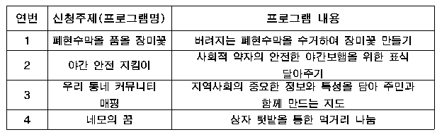 임팩트 프로그램은 기존에 진행되었던 자원봉사 프로그램 중에서 사회문제 해결에 도움이 되었던 프로그램 중 시민들이 지역사회 안에서 더 확산되기를 희망하는 프로그램을 의미한다. 이를 위해 지난 5월 22일(금)부터 6월 30일(화)까지 ‘우리지역에서 이루어진다면 좋을 것 같은 자원봉사 활동은?’이라는 질문으로 엠보팅 투표를 실시했다. 그 결과 ▴ 폐현수막을 품을 장미꽃 ▴야간 안전 지킴이 ▴우리 동네 커뮤니티 매핑 ▴네모의 꿈, 4개의 프로그램이 선정되었다.