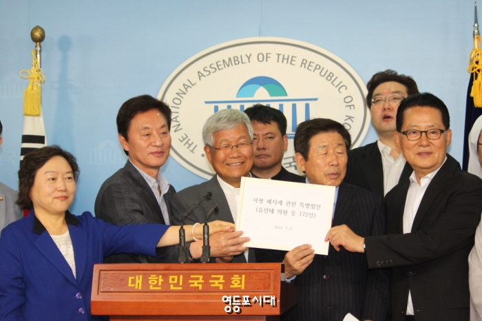 새정치민주연합 유인태, 박지원, 인재근 의원과 새누리당 정두언 의원 등은 6일 국회 정론관에서 기자회견을 열고 ‘사형 폐지에 관한 특별법’을 공동 발의하게 된 배경을 설명하고 “이제 우리는 ‘죽음의 문화’를 ‘생명의 문화’로 바꾸고, ‘인권선진국’의 대열에 오를 기회의 문 앞에 서있다”고 주장하고 “‘사형 폐지에 관한 특별법안’이 법제사법위원회를 거쳐 본회의에서 최종 통과될 때까지 많은 분들의 관심과 동참해 줄 것“을 호소했다. 사형제 폐지 법안의 핵심은 형법 및 기타 법률에서 규정하고 있는 형벌 중 사형을 폐지하고 이를 종신형으로 대체하자는 것이다.