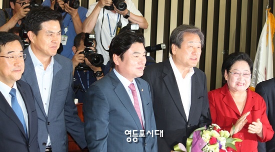 새누리당의 새 원내대표에 수도권 4선 중진인 원유철(경기 평택갑) 의원(오른쪽 사진 가운데)이 선출됐다.