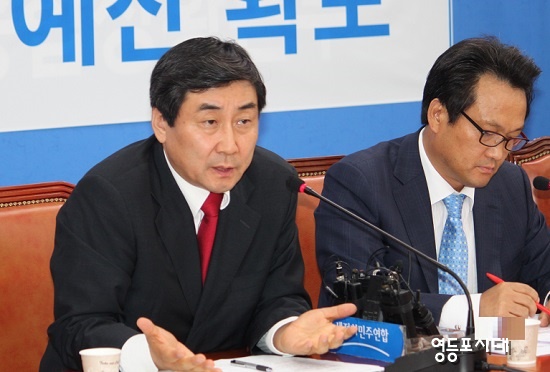 새정치민주연합 이종걸 원내대표(사진 왼쪽)은 14일 오전 국회에서 추경 기자 간담회를 열고 추가경정예산 심사와 관련해 메르스 사태 피해 수습 예산을 지난 9일 새정치연합이 발표한 자체 추경안 3000억 원보다 상향조정된 "4,900억 원으로 증액해야 한다"고 주장했다.