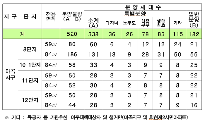 서울의 마지막 남은 대규모 개발지구로 2017년부터 대기업들이 차례로 입주하여 첨단산업단지와 주거‧업무‧상업지역이 어우러진 자족 도시로 조성될 예정인 마곡지구 분양주택 8, 10-1,11, 12 단지에 대해 8월 27일 분양공고하고, 9월 7일부터 특별분양 청약접수가 시작된다.