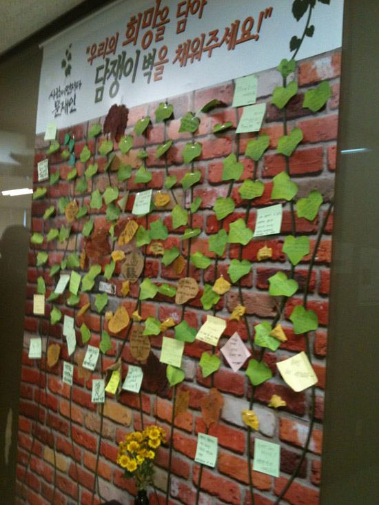 담쟁이 벽에 꽃혀 있는 응원 메시지 ©추광규