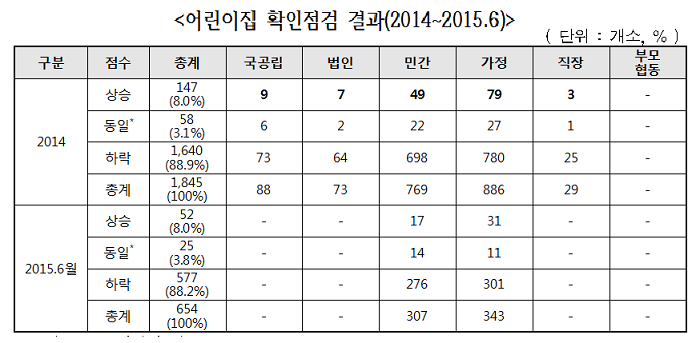 ‘어린이집 확인점검 자료’에 따르면, 어린이집 인증 유효기간이 연장되는 95점 이상의 점수를 받은 어린이집은 2014년 3.1%(56개소), 2015년 6월 현재 3.8%(25개소)에 불과하며, 75점 이상 95점 미만은 2014년 74.4%(1,373개소), 2015년 6월 현재 76.6%(501개소), 재점검 후 인증 유효기관을 6개월 감축하는 75점 미만은 2014년 22.5%(416개소), 2015년 6월 현재 19.6%(128개소)로 나타나 확인점검제도가 시행된 지 4년이 지났음에도 불구하고 평가인증 후 점수 하락이 여전한 것으로 드러났다.