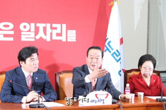 새누리당의 세 가지 어려운 과제로 ▲노동 5법을 연내 처리 ▲선거구획정과 의원정수 문제 ▲당내 경선룰에 대한 확정을 꼽은 서청원 최고위원(오른쪽 사진 가운데)은 작심한 듯 당내 현안 등에 대해 강도 높게 비판했다. 특히 당내 경선문제에 대해 “누구도 그동안 국민경선에 대해 반대한 사람이 없고, 전략공천을 하자고 공식적으로 얘기 한 사람이 없다. 당론이다.”며 김무성 대표의 국민공천제 추진에 대해 단호히 비판한 서청원 최고위원은 “그나마 다행스러운 것은 당에 기구를 만들어서 사실상 물 건너간 국민경선제에 대한 대안을 찾겠다는 김무성 대표의 의총 발언이다”고 한발 물러선 김무성 대표에 대한 속내를 밝혔다. 누구든지 후보를 투표장에 나가서 투표할 수 있는 국민공천제에 대해 “당원도 거기에 포함될 수 있을 것이고, 국민도 포함되는 것이다. 그것이 국민공천제다.”고 강조한 서 최고위원은 “안심번호는 안심번호 국민공천제라는 용어 자체도 빼야 한다”는 말로 새정연 문재인 대표와 안심번호 국민공천제를 합의한 김무성 대표를 비판했다. 국민공천제에 정치생명을 걸겠다고 한 김무성 대표의 발언도 도마 위에 올랐다. 서청원 최고위원은 “왜 이것을 가지고 대표직을 걸어야 하는가?”라고 반문하고 야당이 받지 않으면 단독으로 할 수 없다는 점과 수백억의 예산이 들어가는 문제점을 지적한 후 “이미 물 건너간 안심번호가지고 국민공천제라 하는 것은 빨리 철회해야 한다”고 주장했다.