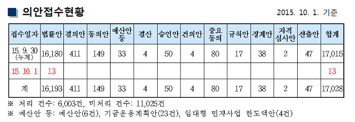 국회사무처(사무총장 박형준)는 2015년 10월 1일(목) 나성린 의원이 대표 발의한 “조세특례제한법 일부개정법률안”, 조정식의원이 대표 발의한 “총포·도검·화약류 등 단속법 일부 개정 법률안” 등 13건의 법률안이 접수되었다고 밝혔다.