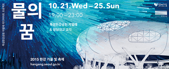 울시(한강사업본부)는 10월 21일(수)부터 10월 25일(일) 5일간 밤 7시부터 11시까지 뚝섬한강공원에서 ‘2015 한강 가을 빛 축제’를 운영한다고 밝혔다. ‘2015 한강 가을 빛 축제’는 한강공원에서 처음 시도되는 야외 미디어아트 프로젝트다. ‘물의 꿈’ 이라는 주제로 제작된 5개의 미디어 아트 작품을 선보일 예정이다. ‘물의 꿈’이란 주제는 시민들이 일상의 고단함과 치열함을 뒤로하고 휴식과 회복을 위해 찾아오는 한강의 근원이 ‘물’ 임에 착안했다. 작가들이 강을 바라보며 구상하고, 표현한 이야기를 접하며 시민들도 각자의 생각과 추억을 정리하고 되새겨보는 기회가 될 것이다. 각각의 작품은 뚝섬한강공원 청담대교 하부의 독특한 형태의 자벌레외벽 3개 구역과 청담대교 교각 중 1개에 상영될 예정으로 지금까지 보지 못했던 가을밤의 한강의 색다른 볼거리를 선사한다. 그 외에도 행사장 인근의 잔디밭을 ‘빛의 정원’으로 조성한다. 발광 다이오드(LED)로 밝힌 장미, 종이배, 풍선 등을 배경으로 사진을 찍거나 야광 스틱을 이용하여 종이배를 만들 수도 있다. 행사장은 지하철 7호선 뚝섬유원지역 2번 또는 3번 출구로 나와 청담대교 하부의 자벌레 방향으로 걸어오면 된다. 이상국 서울시 한강사업본부 총무부장은 "생동하는 여름이 지나고 한강이 고즈넉하게 노랗거나 빨갛게 물드는 가을이다, 이 시기에만 느낄 수 있는 가을밤 한강의 낭만적 풍경을 ‘빛 축제’와 함께 즐겨보시라“고 말했다.