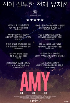 21세기 가장 위대한 블루스, 천재 뮤지션 에이미 와인하우스. 그녀의 모든 것이 담긴 유일한 기록 ‘에이미’는 에이미 와인하우스와 친구들이 함께 찍은 짧은 영상들과 주변인들의 인터뷰를 통해 가족에게 생일 축하 노래를 불러주던 어린 소녀가 어떻게 전 세계가 주목하는 가수로 성장하게 되었는지, 그리고 그 과정에서 무엇이 스물일곱 젊은 그녀의 삶을 앗아갔는지를 담아낸 그녀의 유일한 공식 다큐멘터리다. 제68회 칸국제영화제에 공식 초청되며 화제를 불러 일으켰던 ‘에이미’는 영화의 완성도를 가늠해볼 수 있는 로튼토마토닷컴에서 수 개월이 지난 현재까지도 신선도 지수 96%를 유지하며 그 퀄리티를 입증해 보이고 있다. 또한 국내에서도 언론, 평단, 관객들 모두에게 압도적인 극찬을 받고 있는 중. 이번에 공개된 리뷰포스터에는 ‘에이미의 오리지널 음악이 축복처럼 뿌려지는 영화’(한겨레 남은주), ‘에이미 와인하우스라는 머릿속의 평면이 가슴속에 입체로 옮겨오는 느낌’(영화저널리스트 김세윤), ‘에이미 와인하우스의 음악이 처음 들은 것처럼 새롭게 느껴졌다’(뮤지션 배수정), ‘죽음의 결말을 알고 보면서도 우린 새삼 슬픔에 빠지게 된다’(영화저널리스트 김형석), ‘영화 속 그녀의 삶과 연계돼 가사가 더욱 가슴 아리게 다가온다’(무비스트 최정인), ‘이것은 에이미의 언어이며, 영원히 기억될 그녀의 찬란한 열정이다’(Rolling Stone), ‘우리가 그토록 사랑했던 에이미 와인하우스에 대한 모든 것’(The Daily Telegraph) 등 에이미 와인하우스라는 한 뮤지션에 대한 영화 속 그녀의 진솔하고 인간적인 모습에 대한 그리고 음악을 향한 그녀의 열정에 대한 찬사로 가득하다. 제68회 칸국제영화제, 제33회 뮌헨국제영화제, 제69회 에든버러국제영화제에 공식 초청 되었으며 제11회 제천국제영화제에서 아시아 프리미어로 상영되어 화제를 모은 바 있는 ‘에이미’는 이미 일찌감치 음악팬들과 영화팬들의 주목을 받아 왔다. ‘에이미 와인하우스’라는 재능 넘치던 천재 싱어송라이터의 일생을 단순한 가십을 다루기 위한 자극적 시선이 아닌 진중한 접근으로 지켜보는 것뿐 아니라 ‘Rehab’, ‘Back To Black’, ‘Love Is A Losing Game’ 등 명곡들의 탄생 뒤에 숨겨진 그녀의 진짜 이야기들을 담아내고 있기 때문. 살아생전 [Frank], [Back To Black] 단 두 장의 앨범으로 1,500만장 이상의 판매고를 올린 것과 더불어 [Back To Black]과 앨범의 타이틀곡인 ‘Rehab’으로 그래미 어워드에서 한 해에만 무려 5관왕을 기록한 에이미 와인하우스. 영화는 스타로서의 화려한 이면에 자리한 인간적이고 진솔한 삶의 이야기를 그녀의 음악과 함께 두 시간 내내 스크린에 펼쳐 보인다. 1998년부터 에이미 와인하우스가 우리 곁을 떠나기까지 13년, 4,745일, 113,880시간의 기록이자 3년의 제작 기간, 100여 명의 인터뷰, 20개월에 걸친 편집으로 완성된 ‘에이미’는 11월 5일 개봉해 절찬 상영 중이다.