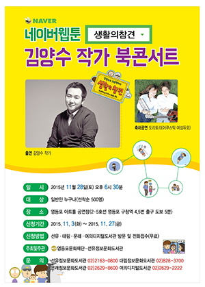 김양수 작가는 일상적 에피소드를 재치 있게 전하는 생활툰의 스테디셀러 작가로 유명하다. 웹툰 「생활의 참견」을 2008년부터 800회 넘게 네이버에 연재하고 있으며 이외에도「아이소포스」,「선생님이 간다」 ,「시우는 행복해」,「사노라면」등을 저술하며 작가로서 활발한 활동을 보여주고 있다. 콘서트는 저자 강연, 관객과의 질의응답 등의 시간으로 꾸며져 무대와 객석이 같이 호흡하는 장이 될 것으로 기대된다. 특히 김양수 작가의 미공개 에피소드 이야기는 놓치지 말아야 할 이번 콘서트의 묘미다. 여기에 실력파 어쿠스틱 여성듀오 도리토리의 공연도 함께 해 깊어가는 가을 콘서트의 여운을 더할 예정이다. 참가 희망자는 오는 27일까지 선유․대림․문래․여의디지털도서관으로 방문 또는 전화접수 하면 되고 콘서트 당일 현장 신청도 가능하다. 선착순으로 500명을 모집하며 참가비는 무료다. 문의 : 교육지원과 (☎ 2670-4165) 영등포문화재단 도서관운영팀 (☎2629-2221) 선유정보문화도서관 (☎ 2163-0800)