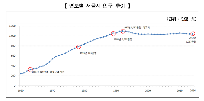 2014년 말 기준 서울시 인구는 1,037만 명으로 전년 대비 18,462명 감소했다. 인구밀도는 1㎢당 1만7,134명으로, 인구 감소에 따라 인구밀도도 낮아지고 있는 것으로 나타났다.