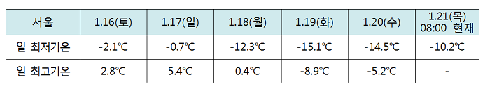 1월 18일(월)부터 21일(목)까지 일 최저기온이 영하 10도 이하로 떨어지면서 오늘(1월 21일) 아침, 이번 겨울 들어 처음으로 한강 결빙이 나타났다. 기상청(청장 고윤화)은 최근 계속된 매서운 한파로 인해 1월 21일(목) 한강이 결빙되었다고 발표했다. 이번 겨울 한강 결빙은 작년(1월 3일)보다 18일 늦고, 평년보다 8일 늦게 결빙된 것이다.