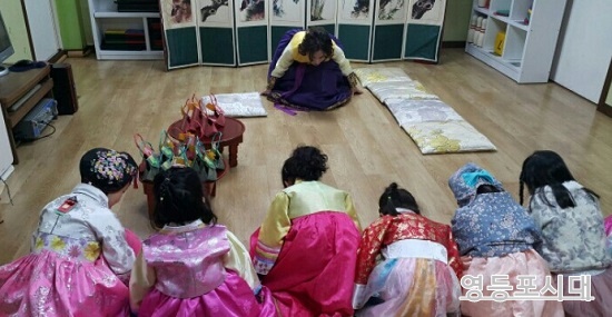 2월 4일 우리의 고유명절인 설날을 나흘 앞둔 2월 4일(목) 당산동에 있는 큰성당어린집(대표 김미애)에서 초등학교 졸업을 앞둔 학생들이 설빔을 곱게 차려입고 김미애 대표에게 세배를 드렸다.(오른쪽 사진)