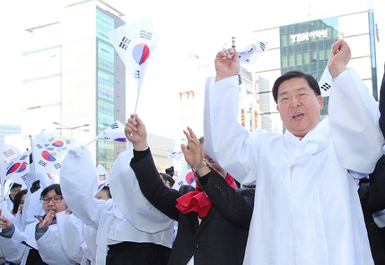 26일 오후 영등포역 앞 광장에서 3.1절 당시의 의상을 입고 만세운동을 재현하며 태극기 달기 캠페인을 진행했다. 이 날 현장에는 조길형 구청장, 보훈단체 회원, 자원봉사자, 주민, 공무원 등 3백여 명이 참여했다. <사진제공 영등포구