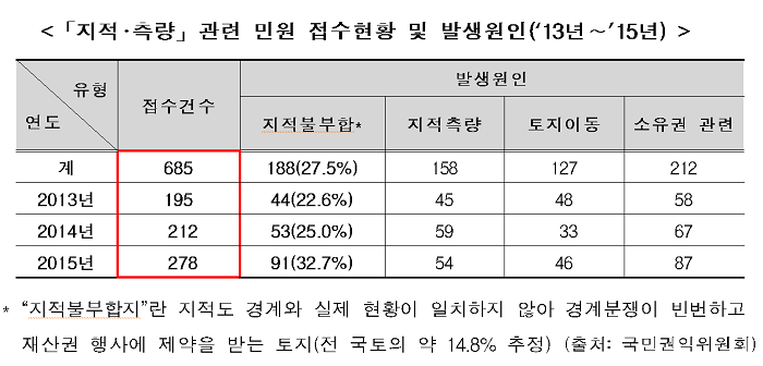 이는 현재의 지적공부가 일제강점기(1910~1924년)에 제작되어 멸실‧훼손 등으로 인해 실제 현황과 일치하지 않기 때문이며, 이런 토지가 전국에 산재되어 있어 정리 과정에 따른 재산피해 및 지적측량 불신으로 인한 민원이 발생하고 있다. 권익위에 도움을 요청하는 지적·측량 분야 민원은 대부분 소유권과 관련된 내용으로, 지적불부합으로 발생되는 재산권 침해, 지적측량으로 인한 경계분쟁, 토지분할·지목변경 등 토지이동과 관련된 민원이 다수 발생되고 있는 실정이다.