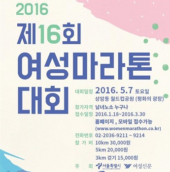 ‘제16회 여성마라톤대회’가 서울시와 여성신문사 공동주최로 5월 7일(토) 오전 8시 30분 서울 마포구 상암동 월드컵공원 내 평화의 광장에서 개최된다.