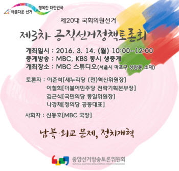 개최된다. 중앙선거방송토론위원회는 오는 3월 14일(월) 오전 10시부터 12시까지 MBC 스튜디오에서 제3차 공직선거정책토론회를 개최한다고 11일(금) 밝혔다. 이번 토론회에서는 새누리당 이준석, 더불어민주당 이철희, 국민의당 이상돈, 정의당 나경채 공동대표가 참여하여 ‘남북외교문제’, ‘정치개혁’을 주제로 토론할 예정이다. 이번 토론회 진행은 신동호 MBC 국장의 사회로 진행되며 MBC·KBS를 통해 전국에 동시 생중계될 예정이며 방송시간에 시청하지 못한 일반 국민은 중앙선거방송토론위원회 누리집「토론회 다시보기」서비스(www.debates.go.kr)를 통해 시청할 수 있다. 또한, 누구나 토론위원회 누리집 「국민모니터링」을 통해 정책토론회에 대한 다양한 의견을 제시할 수 있으며, 참여자 중 추첨을 통해 소정의 상품권도 제공할 예정이다.