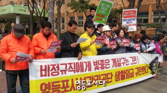 3월 29일 오전 공공비정규직노동조합 서울·경기지부 영등포지회 조합원(아래 조합원) 일동은 영등포구청 앞에서 기자회견을 열고 “영등포구는 화려한 생활임금이 아니라 비정규직자에게 실제 처우를 개선하는 제도를 만들어 줄 것”을 촉구했다. 이어서 조합원 일동은 “최소한의 생활임금을 기본급으로 하고 월급제와 호봉제로 비정규직에 대한 차별을 해소해 줄 것”을 거듭 호소했다. 영등포구는 서울 지역 특성을 고려한 생활임금 도입을 통해 구민이 건강하고 인간다운 생활이 가능한 최소한의 임금 수준을 보장하고자 하는 것을 목적으로 영등포구 생활임금 조례 제8조 제3항 및 같은 조례 부칙 제3조에 따라 ‘2016년 서울특별시 영등포구 생활임금’을 결정하고 이를 고시했다. 생활임금 적용 기간은 1년으로 2016년 1월 1일부터 2016년 12월 31일까지 1년간이다. 주요 내용을 살펴보면 생활임금액을 시급 7,145원, 일급 57,160원, 월급 1,493,305원으로 하고 단, 일급은 일 8시간 및 월급은 월 209시간 근로 기준에 의하는 것으로 되어있다. 생활임금액 임금항목으로는 기본급+교통비+식비+수당이 포함되며 연장근로수당은 제외하며 영등포구 및 영등포구 출자·출연 기관 소속 근로자와 영등포구로부터 그 사무를 위탁받거나 영등포구에 공사, 용역 등을 제공하는 기관 및 업체에 소속된 근로자 420여 명이 대상이다. 영등포지회 조합원 일동은 “영등포구가 6,030원이던 시급을 생활임금제를 적용해 7,145원을 주겠다고 발표했다. 영등포구의 발표에 따르면 시급이 1,115원이 오른다. 일부 언론에서도 그렇게 보도됐다. 그러나 이는 사실과 다르다”라며 언론보도 내용에 대해 강하게 반발했다. 공공비정규직노동조합 서울·경기지부 정진희 사무국장은 “영등포시설관리공단에서 현업 직이라고 부르는 무기계약직과 기간제 230여 명에게 적용되고 있는 생활임금 안에는 식비, 근속수당, 연차수당 등 기존에 받던 것들이 모두 포함되어 있어 실제 인상분은 100원에서 400원 정도밖에 안 된다”라고 주장하고 “실제로 근무하는 시급만 지급하는 임금체계의 생활임금제는 차라리 폐지되어야 한다”라며 목소리를 높였다. 정 국장은 “생활임금을 도입하기 전 실 급여가 156만 원이었던 경력 12년 차의 김 모 씨의 경우를 실례로 들며 지난 2월의 경우 식비와 교통비를 더해 161만 원, 세액을 공제하고 손에 쥔 돈이 겨우 147만 원 이었다”라며 2015년 12월 급여명세서를 공개했다. “생활임금제 적용이 자치단체마다 다른 점과 생활임금제로 임금의 가이드라인을 잡아 조례로 묶어놓아 교섭의 여지가 없다”고 주장한 정 국장은 “궁극적으로는 생활임금을 없애는 것이 목표다”고 강조하고 한 벌 더 나아가 “행정자치부는 제도 차체를 풀어주어야 한다”라고 주장했다. “그동안 생활임금제에 대한 문제점을 해소하기 위해 생활임금제 토론회를 개최하고 생활임금 기준액의 다양한 산정 방법론을 제시해 왔다”라고 밝힌 정 국장은 “자치단체가 운용 중인 생활임금제는 2012년 정부가 내놓은 ‘공공부문 비정규직 고용 개선 추진 지침’보다 더 후퇴했다”라고 일갈했다. 조합원 관계자는 “앞으로 시설관리공단과 구청 관계자들이 참여하는 토론회 등을 개최하여 생활임금제에 대한 문제점에 대해 관계자들의 해명을 요구할 계획이다”고 밝혔다.