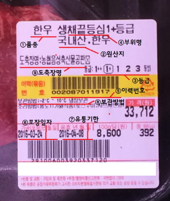 현재 시중 정육점에서 한우등심 등을 비닐포장으로 판매시에는 품종, 부위명, 등급, 도축장명, 보관방법, 포장일자, 유통기한, 원산지, 이력번호까지 총 9가지 사항을 표시토록 되어있다. 이 중 1개라도 표시치 않거나 거짓으로 표시하면 영업정지, 과태료 등의 행정처분를 받게 된다.