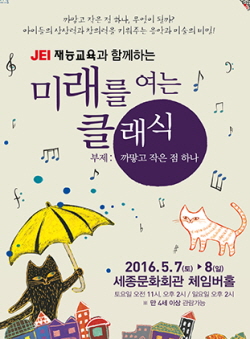 이번 공연은 까맣고 작은 점이 다양한 그림으로 변화하는 영상을 보며 어린이가 자유로운 상상의 나래를 펼칠 수 있도록 하는 클래식 음악회이다. 세종체임버홀 삼면에 도서 ‘까맣고 작은 점 하나(재능교육, 2010)’의 삽화 영상이 펼쳐지며 그에 맞춰 ‘어바웃클래식그룹’이 하이든 ‘말타는 기수’, 비발디의 ‘황금방울새’, 림스키코르사코프의 ‘왕벌의 비행’ 등을 실내악 편성으로 연주할 예정이다. 어린이 눈높이에 맞춰 이야기를 전해주는 해설과 클래식에 맞춰 탭댄스도 함께 준비되어 있어 아이들의 호기심을 자극하고 재미있는 클래식에 대한 인상을 심어주기에 충분하다. 연출가이자 음악가 이동혁이 연출로 참여해 클래식과 영상, 탭댄스가 절묘히 조화된 무대를 선보일 것이다. 만 4세 이상 입장 가능하며 본 공연은 세종문화티켓 및 인터파크에서 예매 가능하다. 티켓가격: 3만원~2만5천원 공연명: 미래를 여는 클래식 ‘까맣고 작은 점 하나’ 일시: 5월 7일(토) ~ 8일(일) 토요일 오전 11시, 오후 2시 / 일요일 오후 2시 (총 3회) 장소:세종문화회관 체임버홀프로그램 안내: 슈만 - 어린이 정경 <트로이메라이> 비발디 - 플룻 협주곡 D장조 <붉은 방울새> 1악장 배고픈 호랑이(어린이 동요) 모차르트 -호른 협주곡 3번, 3악장 하이든 - 현악 4중주 g단조 Op.74-3 <말타는 기수> 4악장 생상 - 동물의 사육제 중 백조 림스키코르사코프 - 벌들의 비행 출연/제작진 : 연출 이동혁, 연주 어바웃클래식그룹, 스토리텔러 심현정, 탭댄서 Mick 김정환 티켓: R석 3만원, S석 2만5천원 관람연령: 만 4세 이상 주최: (재)세종문화회관 후원: 재능교육 예매: 세종문화티켓 공연초대이벤트: 공연정보 꽁알