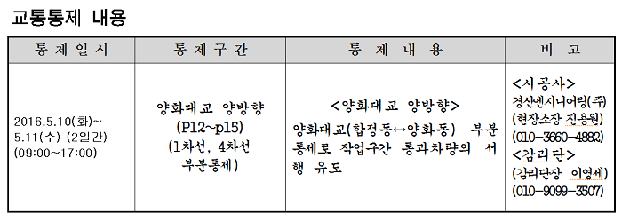 교통 통제하는 작업구간에 교통 혼잡이 발생할 수 있으므로 양화대교 이용 차량은 될 수 있으면 우회도로를 이용하시거나 작업구간 내 서행 및 안전운전해줄 것을 당부했다.