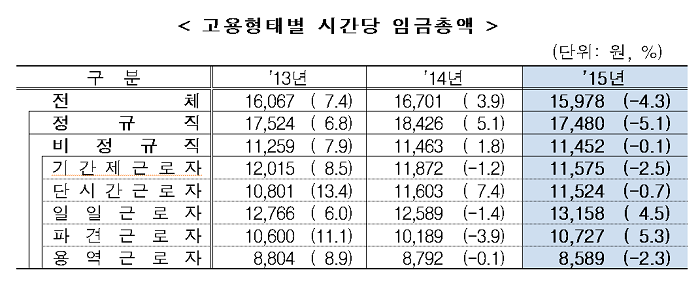 4월 26일 고용노동부가 정규직·비정규직 고용형태에 따른 임금·근로시간 등을 조사한 2015년도 ‘고용형태별 근로실태조사’ 결과에 따르면 이같이 나타났다. ‘월 임금총액’이 1.5% 상승했음에도 ‘시간당 임금총액’이 하락한 이유는 ‘2015년 6월 달력 상 근로일수가 2014년 6월보다 3일 증가하면서 근로시간이 8시간(4.8%) 늘었기 때문으로 분석된다. 즉 근로시간 증감이 임금에 영향을 주지 않는 월급제와 연봉제가 대다수(80.5%)를 차지하고 있어, 달력 상 근로일수 증가가 시간당 임금을 하락시키는 결과로 나타난 것으로 보인다. 정규직의 시간당 임금총액은 17,480원으로 5.1% 감소하였으며, 비정규직은 11,452원으로 0.1% 감소했다.