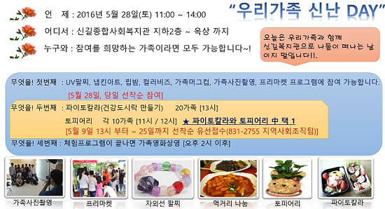 영등포구 신길 종합사회복지관(관장 공상길)은 5월 가정의 달을 맞아 아홉 번째의 ‘우리 가족 신난 day’를 개최한다. 신길 종합복지관은 5월 28일(토) 오전 11시 30분부터 오후 2시까지 2시간 30분 동안 신길 종합사회복지관(지하 2층~옥상까지)에서 지역주민을 대상으로 가족 화분 만들기, 가족사진촬영, 컬러 비즈, 냅킨아트 등 9개 체험부스와 프리마켓과 먹거리 부스를 운영하고 오후 2시 이후 가족영화를 상영한다. 신길 종합복지관은 2008년 이후 9년간 매년 5월 가정의 달을 맞아 가족의 소중함을 느끼고 가족 성원 간 유대감을 형성을 위해 ‘우리 가족 신난 day’를 진행해왔다. 신길 종합복지관은 지역사회의 복지증진과 삶의 질 향상을 위해 지역 사회 내 문제를 예방하고 해결을 위한 가족 중심 사회복지서비스를 제공하는 전문 사회복지기관으로써 소규모 바자회를 열어 지역사회 내 나눔에 대한 인식을 높이고 실천의 기회를 마련하는 등 지역사회를 위해 공헌해 왔다.