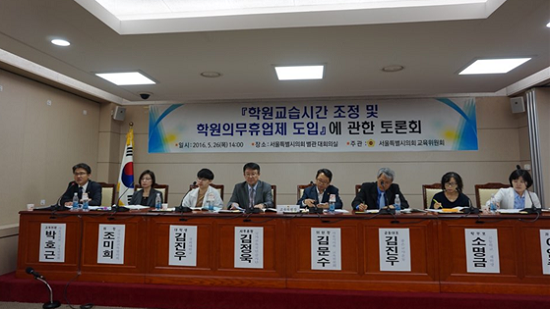 학생들의 건강권 보호와 서민들의 학원비 부담 완화를 목적으로 제정된 ‘서울특별시 학원의 설립·운영 및 과외교습에 관한 조례’에 대해 일부 학부모 및 학생들의 불만이 있지만 한편에서는 학생들의 건강권을 담보하기에는 학원 교습시간을 더욱 제한할 필요가 있다는 주장이 꾸준히 제기되어 왔다. 서울특별시의회 교육위원회는 5월 26일(목) 오후 2시 서울특별시의회 의원회관 2층 대회의실에서 「학원 교습시간 조정 및 학원 의무휴업제 도입」에 관한 의견을 수렴을 위한 토론회를 개최했다. 학생 및 학부모, 교사, 교육 관계 공무원, 시민단체, 학원 관계자 300여 명이 참석 가운데 진행된 이 날 토론회는 서울시 교육위원회 박호근 위원이 사회와 주제발표를 맡고 김문수 교육위원회 위원장이 좌장으로 참석했다. 토론자로 김진우 좋은교사운동 공동대표, 김정욱 국가교육국민감시단 사무총장, 소명금 고등학교 재학생 학부모, 김진우 경희대학교 재학생, 조미희 전국보습교육협의회 회장, 이연주 서울시교육청 평생교육과 과장이 토론자로 나섰다. 박호근 의원은 “현재 조례상 학교급별과 관계없이 학원 및 교습소 교습시간을 일률적으로 22시까지 제한하고 있는 것이 문제”며 “고등학생에 있어서는 학습권을 제한하는 부분이 크다”고 주장했다. 박 의원은 이어서 “초등학생은 21시, 중학생은 22시, 고등학생은 23시로 교습시간을 학교급에 따라 조정 운영해야 할 것과 과도한 학업에 시달리는 학생들의 휴식권 보장을 위해 학원 의무휴업제도의 도입을 제안한다” 고 밝혔다. 이에 토론자들은 “시대적 요구에 역행하는 것” “제한시간으로 인해 음지에서 공부하거나 고액과외를 받는 학생이 늘고 있다”라는 등 찬반 의견이 팽팽하게 맞선 가운데 “교육의 근본적인 문제인 공교육이 학생들의 교육을 완벽하게 책임지는 사회가 실현되어야 한다”라는 데는 모두 한목소리를 냈다. 학원운영시간 조정과 학원 의무휴업제 도입에 대해서는 찬반 의견이 팽팽히 맞서고 있는 만큼 더 많은 의견수렴을 걸쳐 신중하게 결정되어야 할 것으로 보인다.