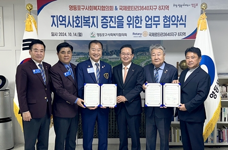 영등포구사회복지협의회(아래 영사협, 회장 박영준)은 10월 14일 영등포구청에 국제로타리3640지구 8지역(대표 차병규)과 업무협약을 체결했다.