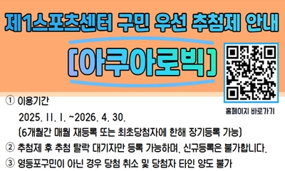 영등포구시설관리공단이 영등포 제1스포츠센터에서 운영하는 아쿼로빅(수중 에어로빅) 강좌 신청 방법을 바꿔 구민 우선 추첨제를 시행한다. 영등포구시설관리 공단이 10월 2일 오전 배포한 자료에 따르면 인기종목인 아쿠아로빅 하반기 구민 우선 추첨제 시행 후 이용 2025-10-09 11:09:21