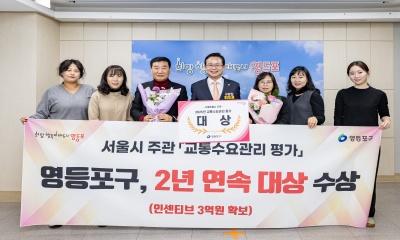 영등포구(구청장 최호권)가 ‘2025년 서울시 교통수요관리 평가’에서 2년 연속 자치구 1위인 ‘대상’을 수상했다. 구는 이번 평가로 인센티브 3억 원을 포함한 징수교부금 37억 8천만 원을 확보했다. 서울시 교통수요관리 평가는 교통혼잡 완화와 저탄소 교통체계 구 2026-01-07 12:49:23