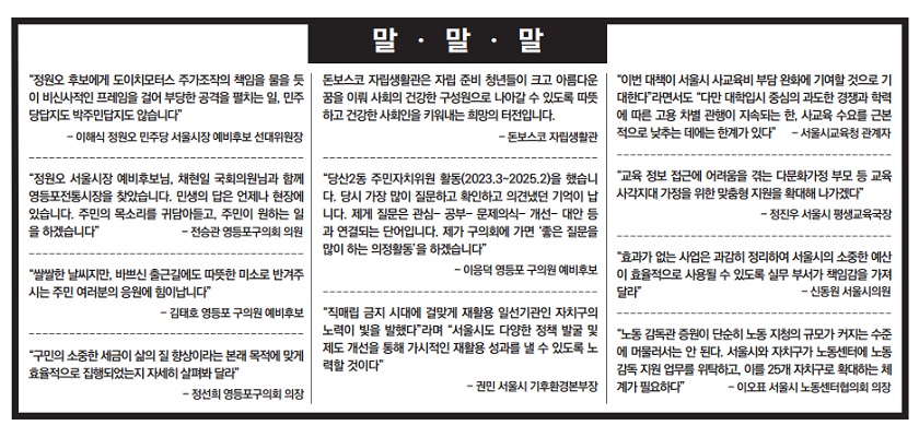 -이해식 정원오 민주당 서울시장 예비후보 선대위원장 “추미애 국회의원님을 깜짝 만나 인사드렸습니다. ‘건승하세요’ 인사와 ‘추미애 파이팅’으로 마무리하고, 영등포역 4번 출구 인사와 신풍시장, 푸르지오아파트, 영등포공원, 신길3동 노인회 등 인사를 드렸습니다” -서천열 영등포 구의원 예비후보 “정원오 서울시장 예비후보님, 채현일 국회의원님과 함께 영등포전통시장을 찾았습니다. 민생의 답은 언제나 현장에 있습니다. 주민의 목소리를 귀담아듣고, 주민이 원하는 일을 하겠습니다” -전승관 영등포구의회 의원 “당산2동 주민자치위원 활동(2023.3~2025.2)을 했습니다. 당시 가장 많이 질문하고 확인하고 의견냈던 기억이 납니다. 제게 질문은 관심-공부-문제의식-개선-대안 등과 연결되는 단어입니다. 제가 구의회에 가면 ‘좋은 질문을 많이 하는 의정활동’을 하겠습니다” -이응덕 영등포 구의원 예비후보 “쌀쌀한 날씨지만, 바쁘신 출근길에도 따뜻한 미소로 반겨주시는 주민 여러분의 응원에 힘이납니다” -김태호 영등포 구의원 예비후보 "돈보스코 자립생활관은 자립 준비 청년들이 크고 아름다운 꿈을 이뤄 사회의 건강한 구성원으로 나아갈 수 있도록 따뜻하고 건강한 사회인을 키워내는 희망의 터전입니다" -돈보스코 자립생활관 “직매립 금지 시대에 걸맞게 재활용 일선기관인 자치구의 노력이 빛을 발했다”라며 “서울시도 다양한 정책 발굴 및 제도 개선을 통해 가시적인 재활용 성과를 낼 수 있도록 노력할 것이다” 권민 서울시 기후환경본부장 “구민의 소중한 세금이 삶의 질 향상이라는 본래 목적에 맞게 효율적으로 집행되었는지 자세히 살펴봐 달라” -정선희 영등포구의회 의장 252호 26.3.24 발행/배포