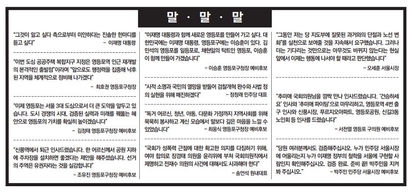 -이재명 대통령 “이번 도심 공공주택 복합지구 지정은 영등포역 인근 재개발의 본격적인 출발점”이라며 “앞으로도 행정력을 집중해 낙후된 지역을 체계적으로 정비해 나가겠다” -최호권 영등포구청장 “이제 영등포는 서울 3대 도심으로서 더 큰 도약을 앞두고 있습니다. 도시 경쟁의 시대, 검증된 실력과 미래를 꿰뚫는 혜안으로 영등포의 가치를 확실히 높이겠습니다” -김정태 영등포구청장 예비후보 “이재명 대통령과 함께 새로운 영등포를 만들어 가고 싶다. 대한민국에는 이재명 대통령, 영등포구에는 이승훈이 있다. 김민석의 영등포를 일등포로, 채현일의 탁트인 영등포, 이승훈이 함께 만들어 가겠습니다” -이승훈 영등포구청장 예비후보 “신풍역에서 퇴근 인사드렸습니다. 한 어르신께서 공원 지하에 주차장을 설치하면 좋겠다는 제안을 해주셨습니다. 선거의 주역은 유권자라는 것을 실감합니다” -조유진 영등포구청장 예비후보 “독거 어르신, 청년, 아동, 다문화 가정까지 지역사회를 위해 묵묵히 봉사하고 계신 모습에서 말보다 깊은 마음을 느낄 수 있었습니다” -최웅식 영등포구청장 예비후보 “사적 소명과 국민의 열망을 받들어 검찰개혁 완수와 사법 정의 실현을 위해 매진하겠다” -정청래 민주당 대표