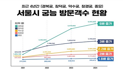 최근 4년간 궁궐 방문객은 K-컬처 인기에 힘입어 6배로 증가한 것으로 나타났다. 그러나 관리 인원 충원은 고작 6명에 그쳤다. 손솔 진보당 국회의원이 궁능유적본부로부터 제출받은 최근 4년간 서울 시내 주요 궁궐 방문객 인원 자료를 분석한 결과 이같이 나타났다. 2025-10-12 14:18:21