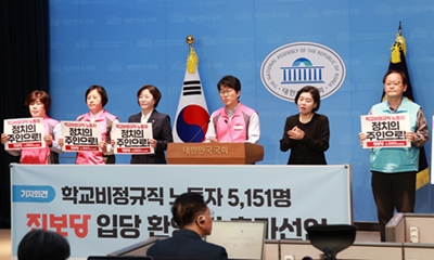 학교 비정규직 노동자 5,151명은 3월 24일 국회 소통관에서 기자회견을 열고 진보당에 입당한다고 밝혔다. 민태호 전국 학교 비정규직노동조합 위원장은 이날 발언에서 “전국 학교 비정규직노동조합이 만들어진 지 16년이 되었다”라며 “비정규직 종합백화점이라 불 2026-03-24 15:08:30