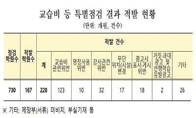 서울시교육청은 서울시 내 학원·교습소 730개원(소)을 점검해 167개원(소)에서 총 228건의 위반 사항을 적발했다고 밝혔다. 이번 점검은 정부의 민생 물가 특별 관리 기조에 맞춰 신학기 사교육비 부담 완화와 교습비 안정화를 위해 실시됐다. 서울시교육청은 애초 2026-04-21 15:51:27