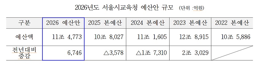 서울특별시교육청(정근식 교육감)이 내년도 예산안으로 2025년 본예산(10조 8,027억 원)보다 6,746억 원(6.2%) 증가한 총 11조 4,773억원을 편성해 10월 31일(금) 서울시의회에 제출했다. 2024년 예산(11조 1,605억 원)과 비교해 3,168억 원(2.8%) 늘어난 규모다.
