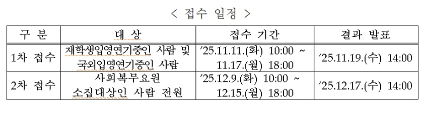 1차 접수는 재학생 입영 연기자와 국외 입영 연기자를 대상으로, 2차 접수는 12월 9일(화)부터 사회복무요원 소집 대상자 전원을 대상으로 진행한다.