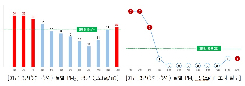 서울시는 2019년부터 매년 미세먼지 고농도가 잦은 12월부터 이듬해 3월까지 4개월 동안 평소보다 강화된 미세먼지 저감 대책을 집중적으로 추진해 고농도 발생 빈도와 강도를 줄이고 있다. 우선 수송 분야에서는 배출가스 관리·감독을 강화한다. 계절관리제 기간 중 평일 오전 6시부터 오후 9시까지 서울 전역에서 배출가스 5등급 차량의 운행을 제한하고, 해당 차량이 시영주차장을 이용할 경우 주차 요금을 50% 할증해 부과한다. 운행차의 매연저감장치(DPF) 훼손·탈거, 공회전(이륜차 포함)에 대해 자치구와 합동 단속도 한다. 아울러 서울 전역 민간 자동차검사소를 대상으로 배출가스 검사 장비의 정상 작동 여부와 검사 절차 준수 여부 등을 자치구, 한국교통안전공단과 합동 점검해 부실 검사를 사전에 차단한다.