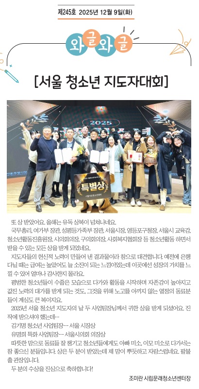 2025년 서울 청소년 지도자의 날 두 사업팀장님께서 귀한 상을 받게 되셨어요.