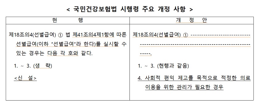 보건복지부(장관 정은경) 2월 19일 관리급여 제도의 법적 근거를 마련하는 내용의 ‘국민건강보험법 시행령’ 일부개정령안이 공포된다라고 밝혔다. ‘국민건강보험법 시행령’ 제18조의4 제1항 선별급여 실시 대상에 “사회적 편익 제고를 목적으로 적정한 의료 이용을 위한 관리가 필요한 경우”를 추가하여 비급여 중 적정한 관리가 필요한 항목들을 선별급여의 한 유형인 관리급여로 편입됐다. 이를 통해 관리급여 항목에 대해서는 가격을 설정해 본인부담률 95%로 적용하며, 진료기준을 설정함으로써 무분별한 의료 이용은 억제하는 등 제도적 틀 안에서 체계적으로 관리해 나갈 계획이다.