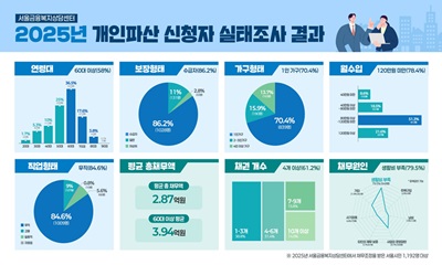 지난해 서울회생법원에 제출된 개인파산 신청 총 8,516건 중 14.0%에 달하는 1,192건이 서울시복지재단 서울금융복지상담센터로 접수된 것으로 분석됐다. 서울시복지재단 서울금융복지상담센터가(아래 센터) 9일 발표한 지난해 센터로 접수된 개인파산 신청 유효 데이 2026-03-10 15:13:41