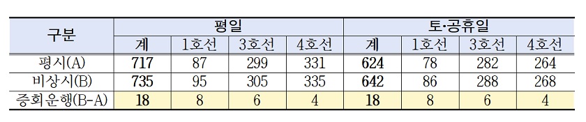 만일의 사태에 대비하여 지하철과 동차 5편성을 비상대기한다. 또한 광역 간 이동 불편을 최소화하기 위해 지하철 1‧3‧4호선 열차 운행을 18회 증회 운영할 예정이다.